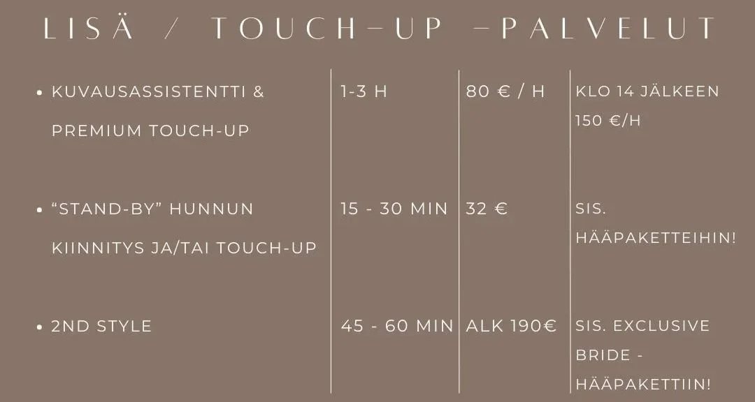 Kaikki kampaushinnat sisältävät käytettävät perustarvikkeet, kuten muotoilutuotteet, hiusdonitsit/täyttöpalat, pinnit ja hiuskuminauhat. Hiustenpidennykset on vuokrattavissa erikseen. Mikäli toivot kampauksen tueksi koristeita/koruja, kimalletta tai muuta vastaavaa – voi myyjältä pyytää suosituksia näihin.